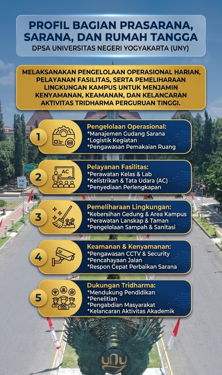 Melaksanakan pengelolaan operasional harian, pelayanan fasilitas, serta pemeliharaan lingkungan kampus untuk menjamin kenyamanan, keamanan, dan kelancaran aktivitas tridharma perguruan tinggi.